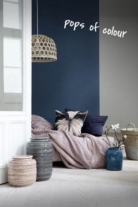 4. POPS OF COLOUR: Use navy as a beautiful backdrop to anchor your look and add pops of vibrant hues to make the space feel fun and playful. Blankets, pillows, paintings, and lighting are great way to bring in exciting colour!